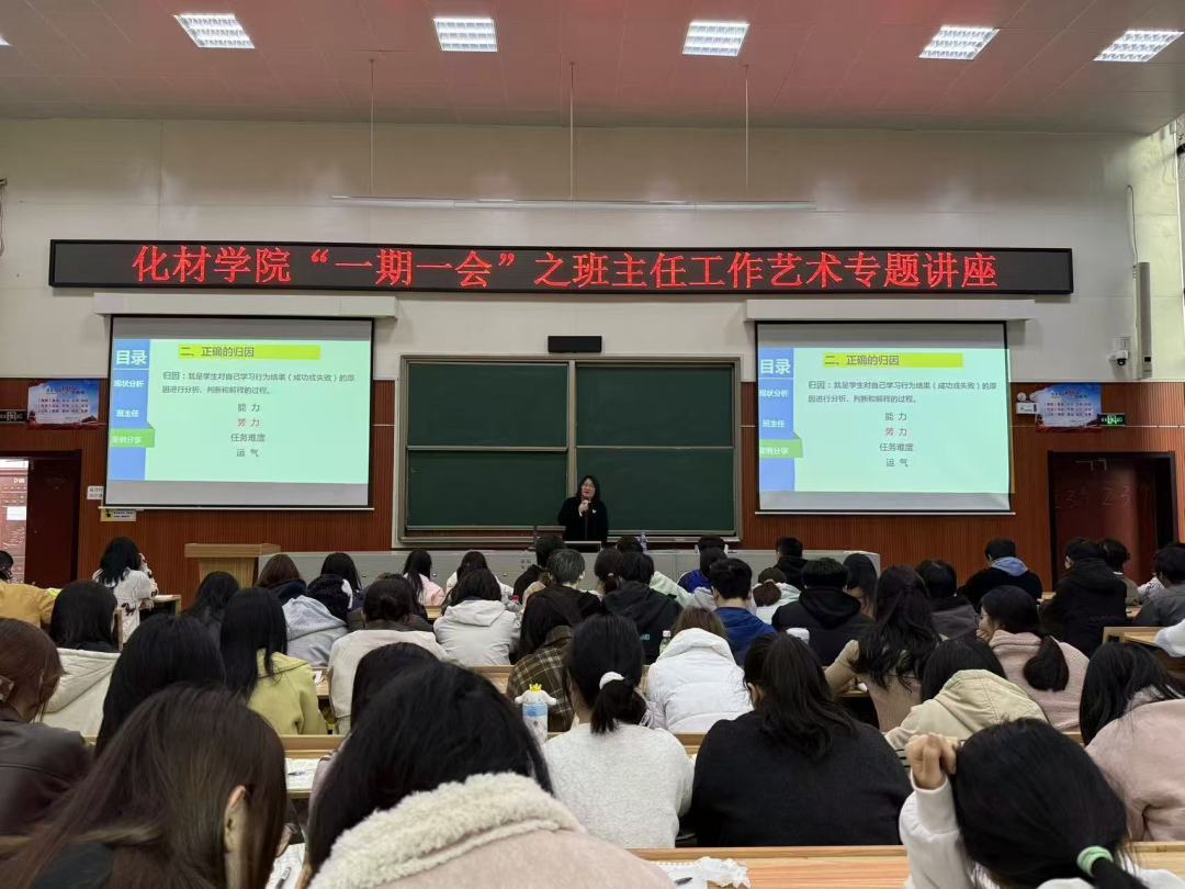 (通讯员 曹翠芳)为提升班主任育人能力、探索新时代班级管理方法,2025年11月25日,化材学院“一期一会”之班主任工作艺术专题讲座在逸夫楼西附楼D103顺利开展,本次讲座特邀“常德市优秀班主任”吕霞老师担任主讲,学院化学师范专业全体学生齐聚现场,沉浸式学习新时代班级管理与育人技巧。