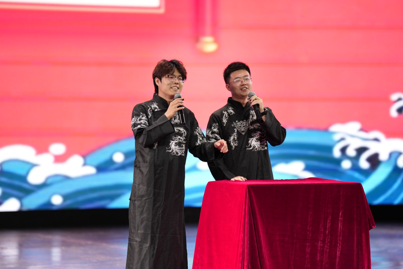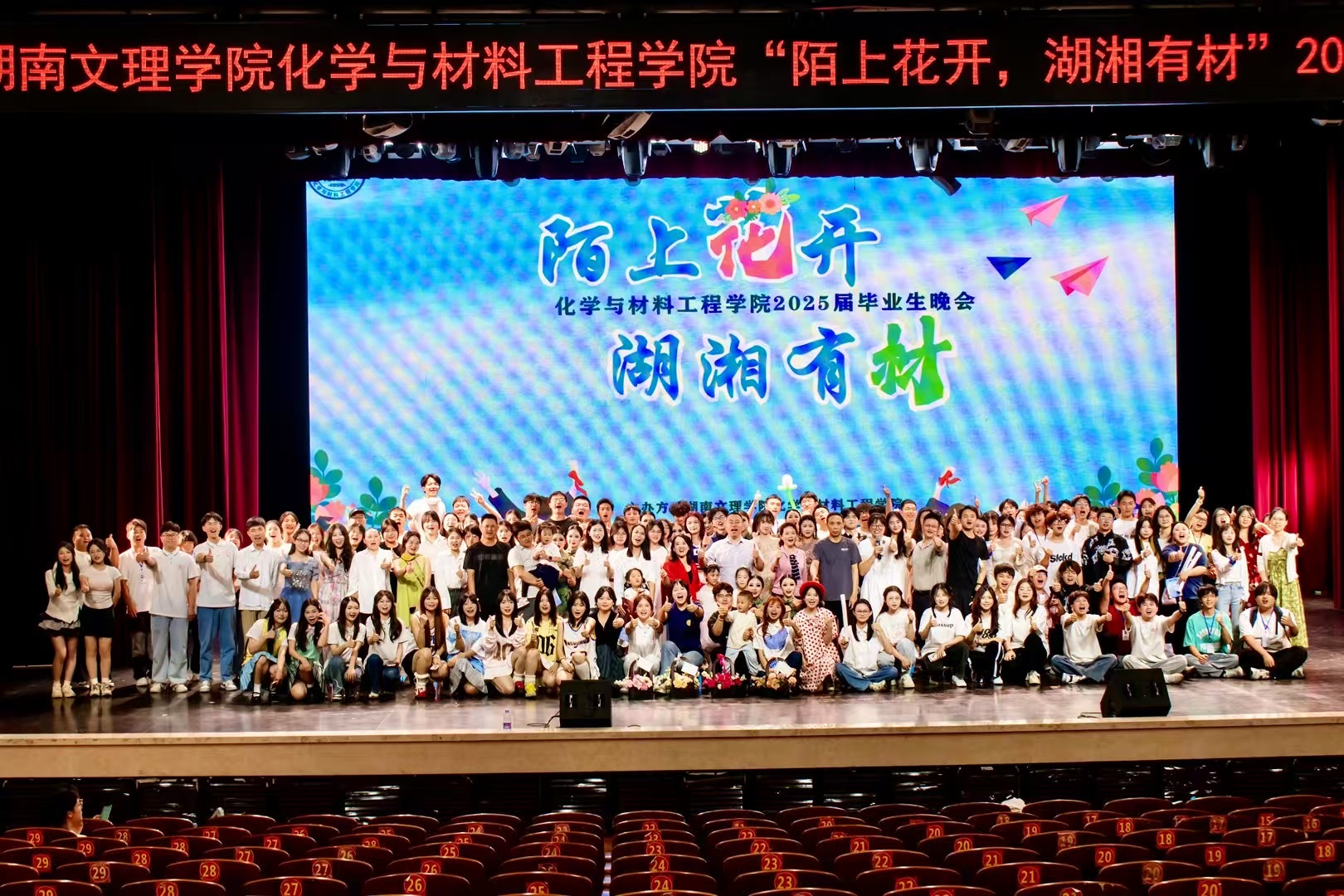 在这片湖湘大地上,产生了无数动人的旋律。今晚,我们以“陌上花开”为引,以“湖湘有材”为名,用歌声致敬这片土地赋予我们的灵性与豪情。晚会穿插了多轮抽奖环节,幸运观众获得了学院定制纪念品,更是有幸运大奖被抽取,现场欢呼声此起彼伏,气氛热烈。终场歌曲串烧《歌叙青春路》以“时光列车”载着化材学子们驶过,学士帽抛向空中的刹那,回忆在背景屏上绽放,定格“陌上花开”的永恒瞬间。